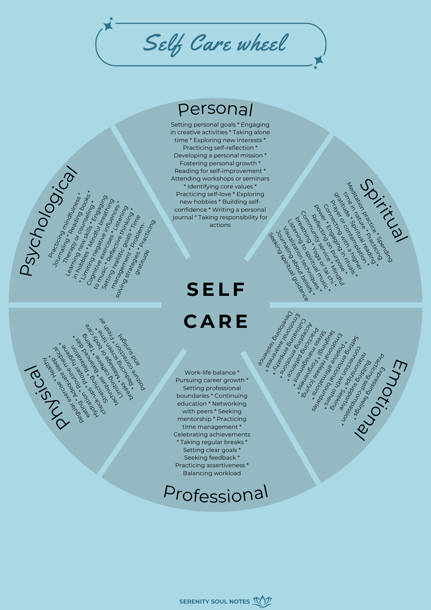 A visual guide to different areas of self-care—physical, emotional, social, and more—to help you build a balanced, nourishing routine.