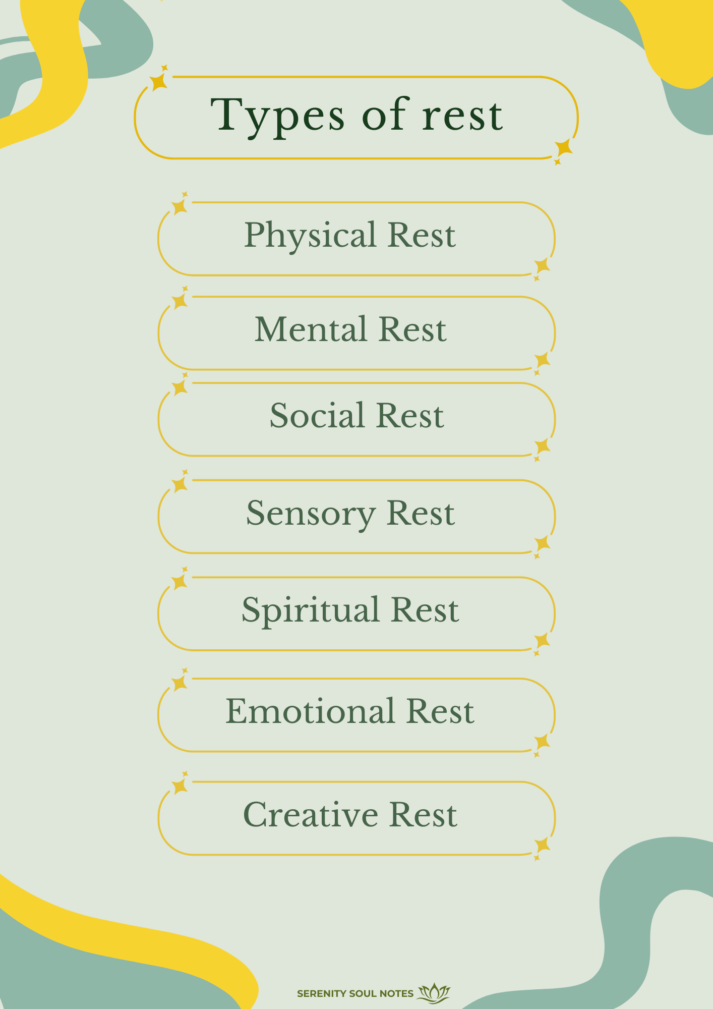 A beautifully designed poster outlining different kinds of rest — physical, mental, emotional, and more — to remind you to care for all aspects of your health.