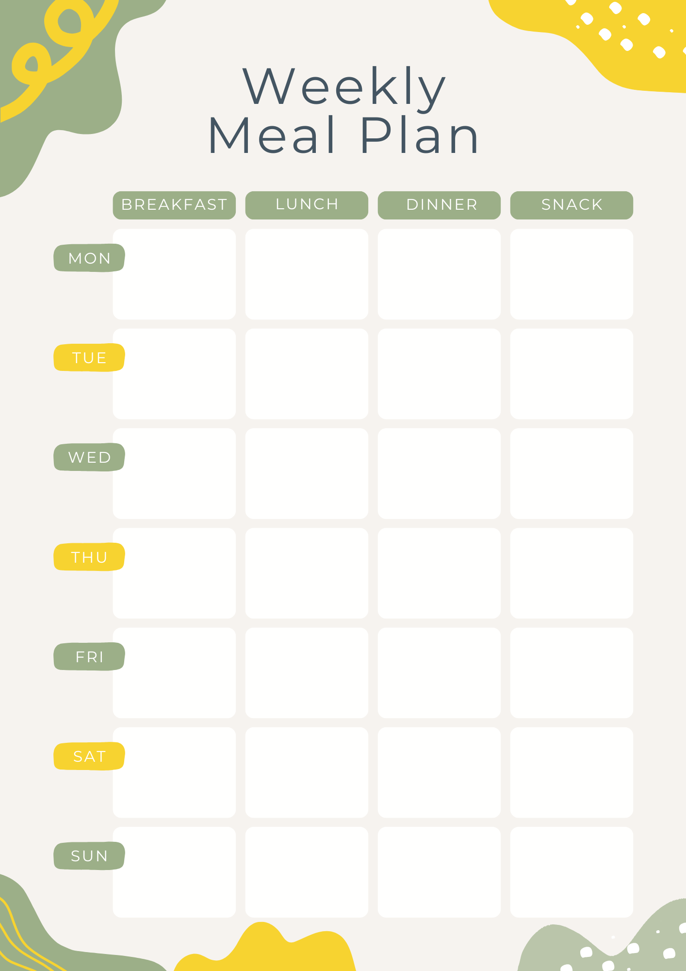 A simple, nutritious meal planning template to help you organize balanced meals for the week, supporting your physical well-being and time management.