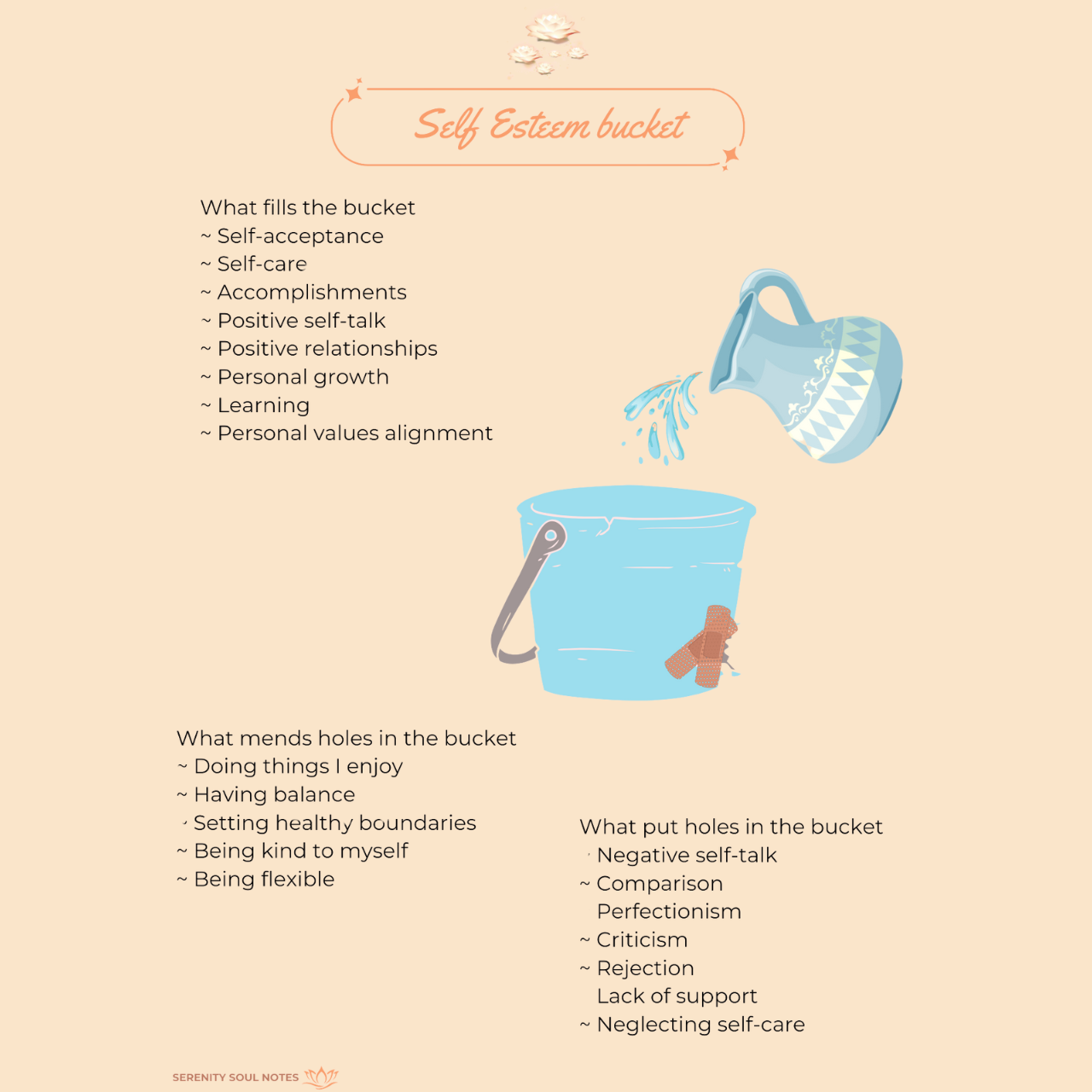 A visual reminder to fill your “self-esteem bucket” daily with kind words, positive actions, and healthy habits that nurture your confidence.